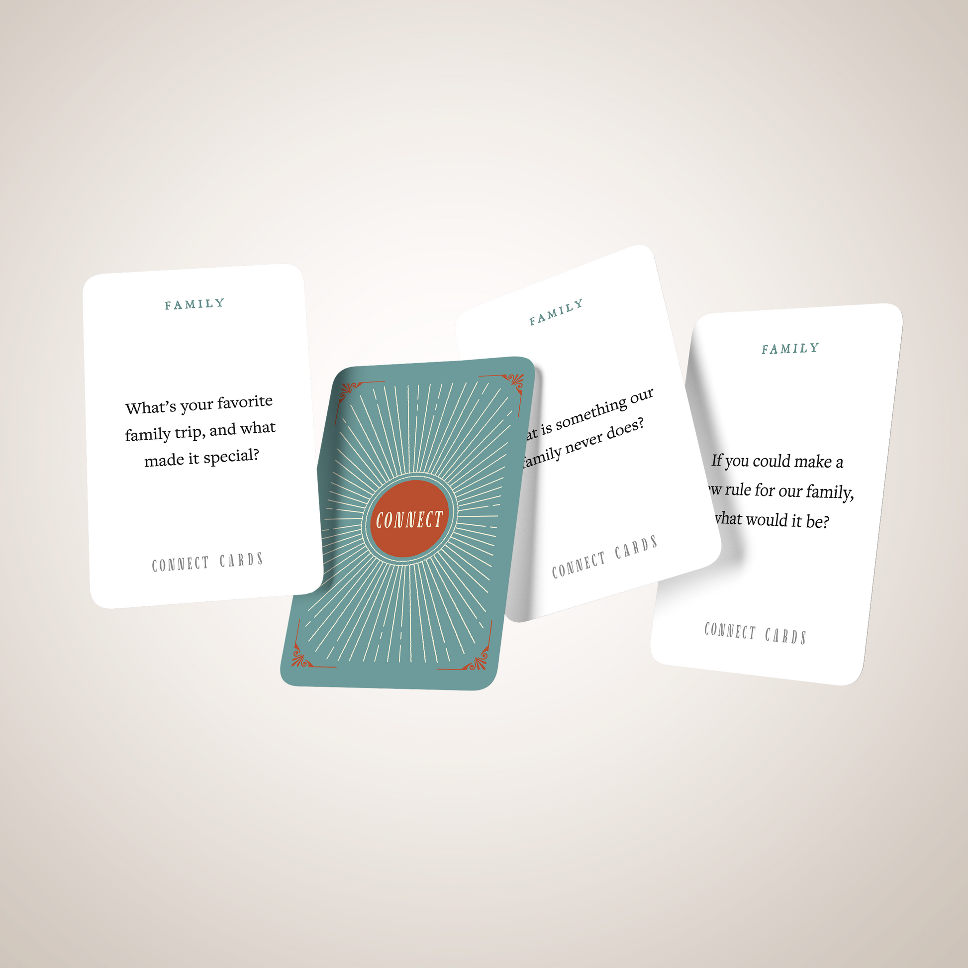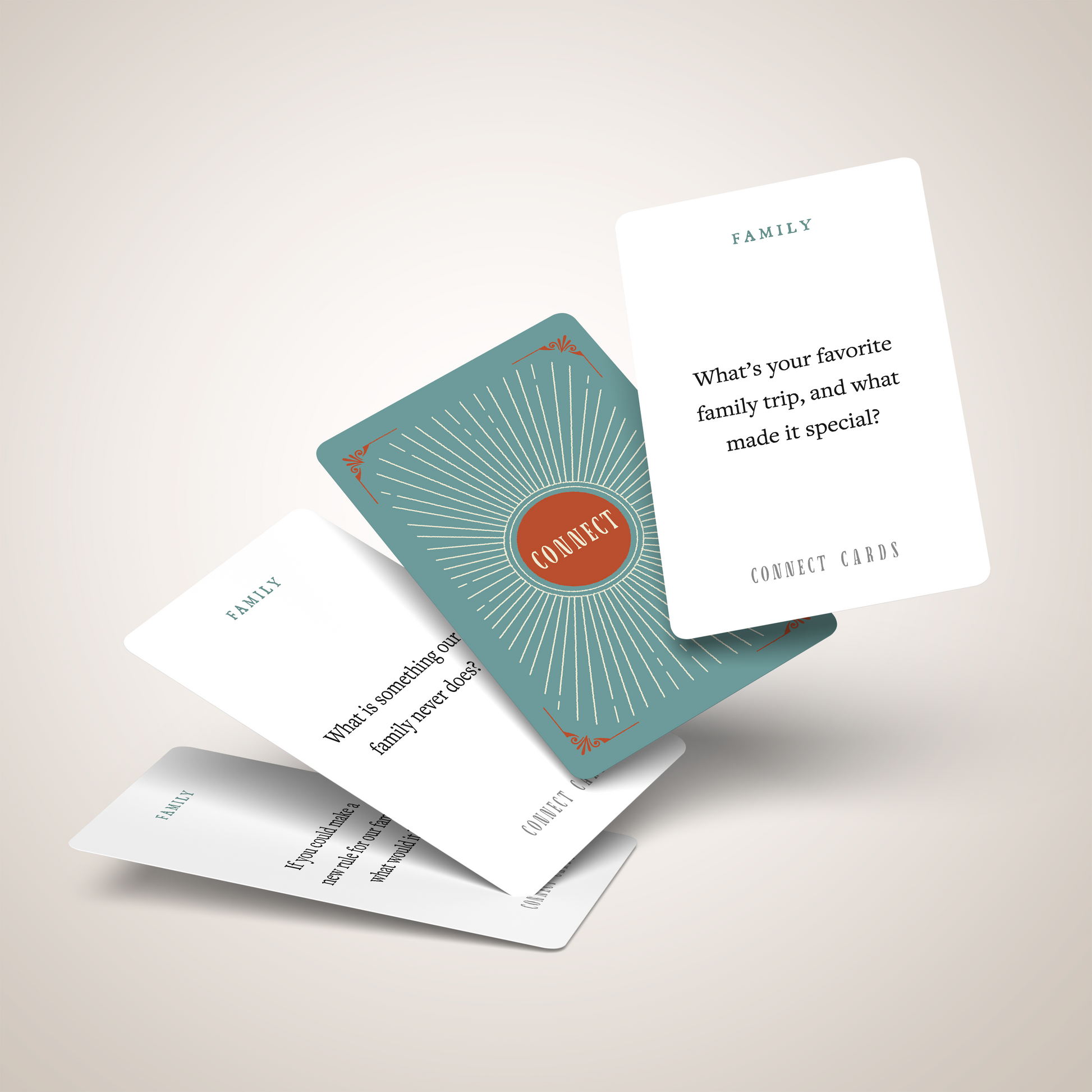 Connect Cards are designed to help families bond through engaging, heartfelt, and fun conversations. Each card features a unique prompt or question that invites storytelling, laughter, and meaningful interactions—whether you're sharing a meal, relaxing at home, or on the road together.